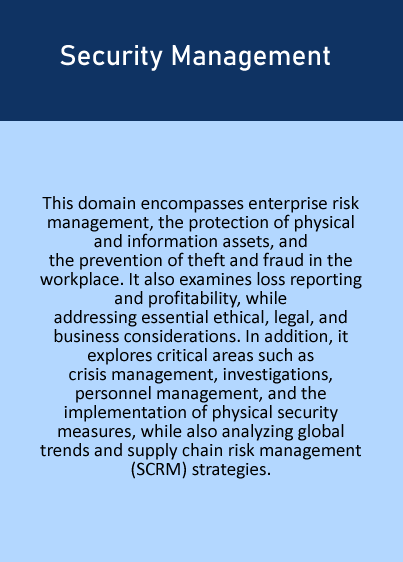 This immersive course is designed to provide you with a comprehensive understanding of all aspects of security, based on the ASIS International domains of knowledge. You will prepare for the CPP® exam through a flexible, fully online program. After successfully completing our course exams, you will receive a certificate in “Security Profesional Management”, regardless of whether you choose to take the ASIS International certification exams to earn the CPP® credential.