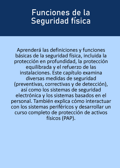 El curso se divide en 17 capítulos, cada uno de los cuales cubre aspectos clave de la seguridad física. A continuación se ofrece un resumen de los aspectos más destacados del plan de estudios: